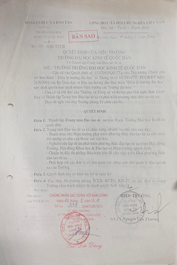 Quyết định thành lập Trung tâm đào tạo từ xa – NEU