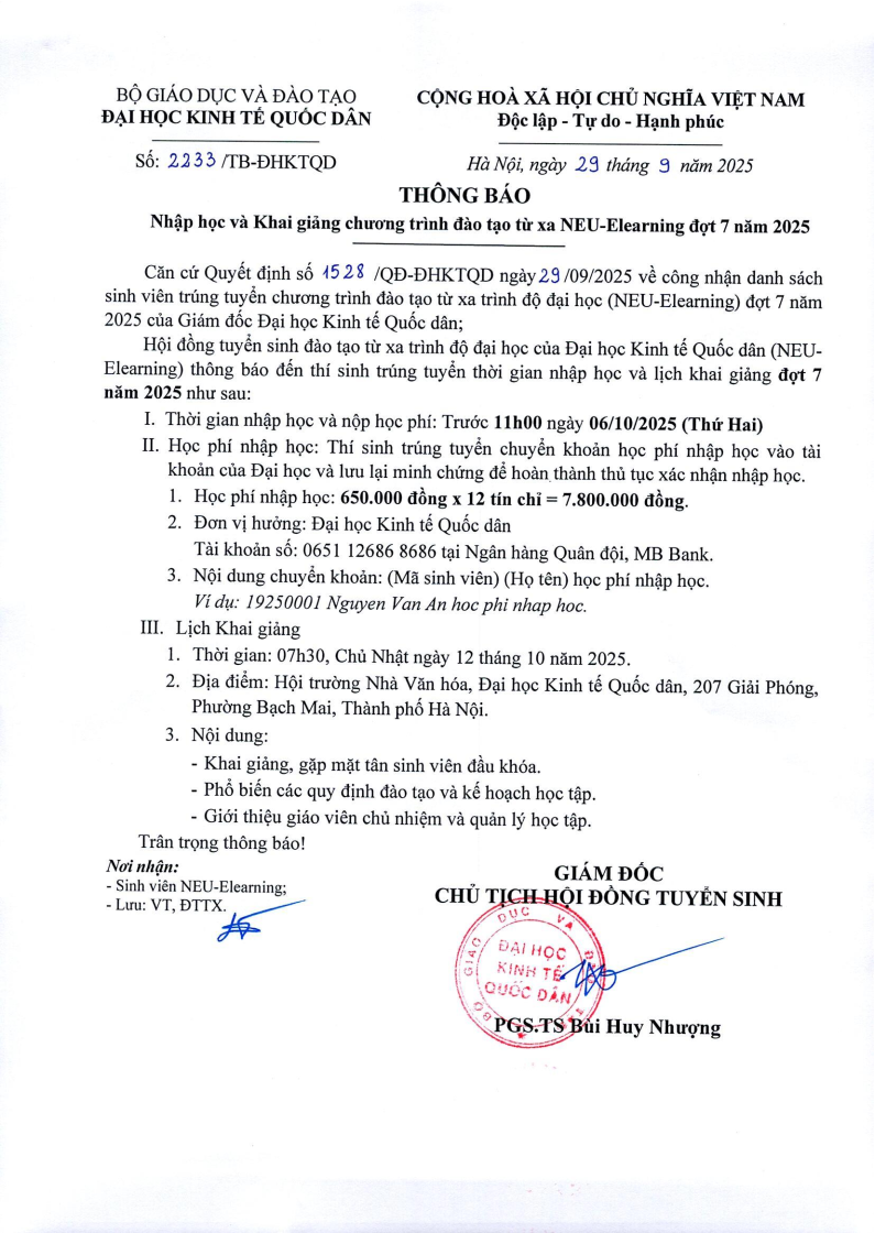 Thông báo nhập học và khai giảng đợt 7 năm 2025