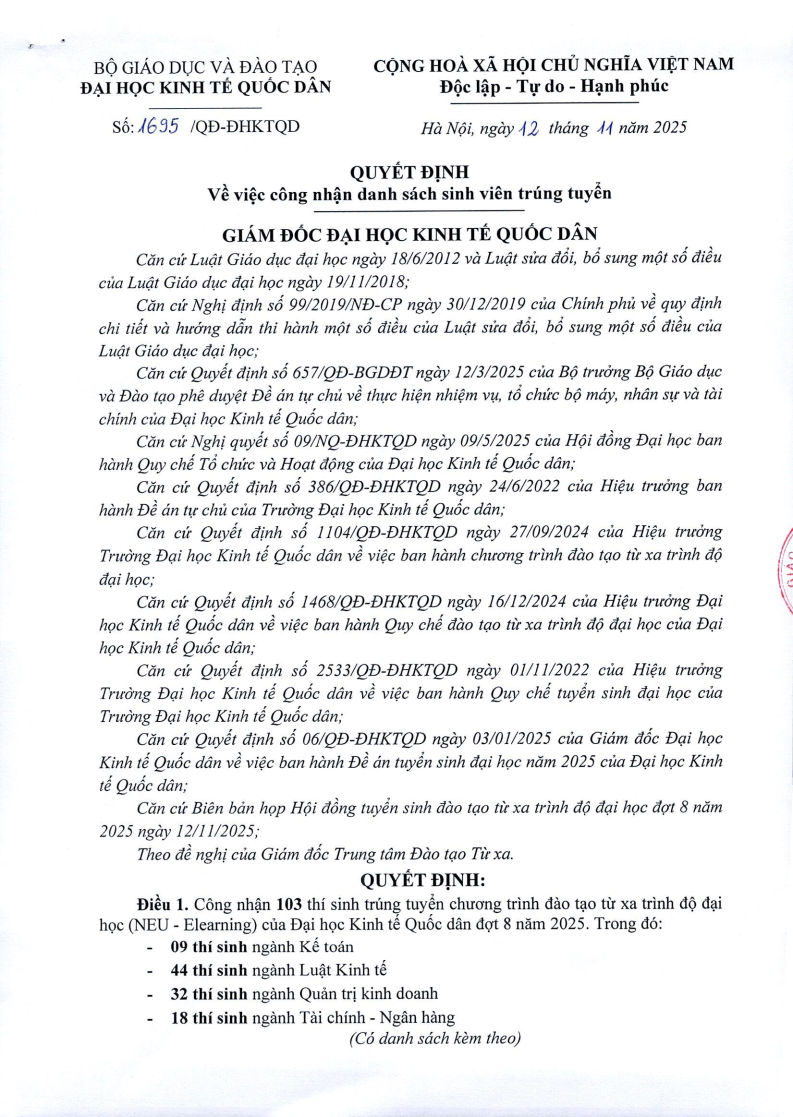 Quyết định về việc công nhận danh sách sinh viên trúng tuyển đợt 8 năm 2025