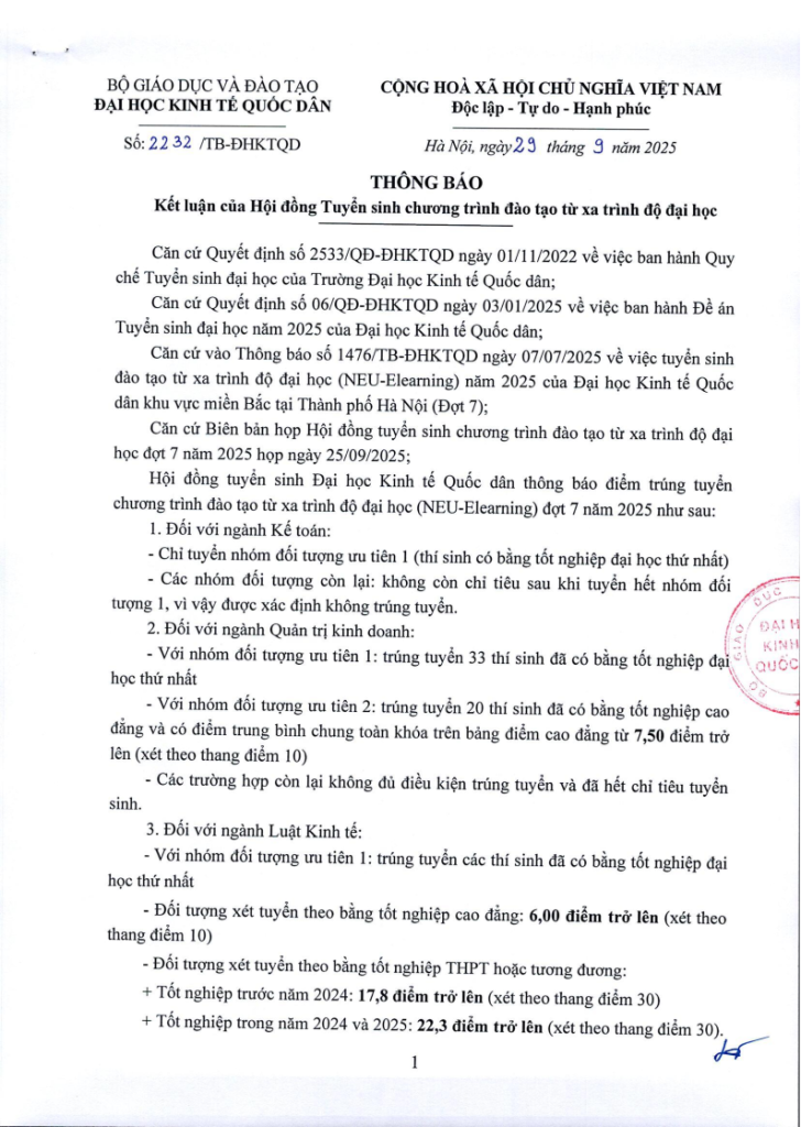 Sự Kiện, Thông báo, Tin Tức, Tuyển SinhThông báo điểm trúng tuyển đợt 7 năm 2025 Posted on 29/09/2025 by Nguyễn Minh Hoàng Quyết định về việc công nhận danh sách sinh viên trúng tuyển đợt 7 năm 2025 Quyết định thành lập Trung tâm đào tạo từ xa – NEU