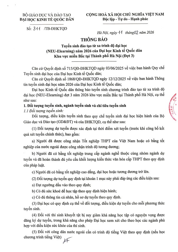 Thông báoTHÔNG BÁO TUYỂN SINH NEU-Elearning năm 2026 Khu vực miền Bắc tại Thành phố Hà Nội (ĐỢT 3) Posted on 20/02/2026 by Admin Sinh viên Luật kinh tế E-NEU có sợ thất nghiệp không? THÔNG BÁO TUYỂN SINH NEU-Elearning năm 2026 Khu vực miền Nam Thành phố Hồ Chí Minh & NHẬT BẢN (ĐỢT 4)