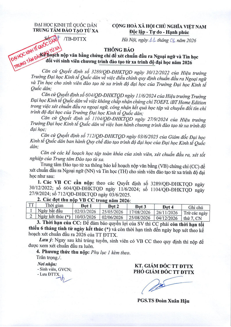 CHUẨN ĐẦU RA TIN HỌC VÀ NGOẠI NGỮThông báo Kế hoạch nộp văn bằng chứng chỉ để xét chuẩn đầu ra Ngoại ngữ và Tin học đối với sinh viên chương trình đào tạo từ xa trình độ đại học năm 2026 Posted on 25/03/202609/04/2026 by decadmin Thông báo Kế hoạch nộp văn bằng chứng chỉ để xét chuẩn đầu ra Ngoại ngữ và Tin học đối với sinh viên chương trình đào tạo từ xa trình độ đại học năm 2026 Link nộp bản scan chứng chỉ Các quy định, văn bản về chuẩn đầu ra tin học và ngoại ngữ Kế hoạch xét Tốt nghiệp, Chuẩn đầu ra, Cảnh báo Thôi học Các quy định, văn bản về chuẩn đầu ra tin học và ngoại ngữ